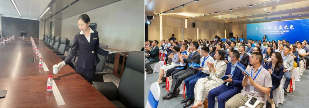 作为国际技术转移成果转化的示范平台,深圳清华大学研究院新大楼常年有重要交流会议和学术会议,大楼会务团队深谙国际交流需求,结合接待级别、参观交流规模,提供礼仪引导、定制化设备调试、专业翻译支持、应急保障预案等全流程服务。从跨国学术论坛到高端政企峰会,年均保障超200 场高端会议,以零失误率、高满意度获科研机构与国际友人双重认可。