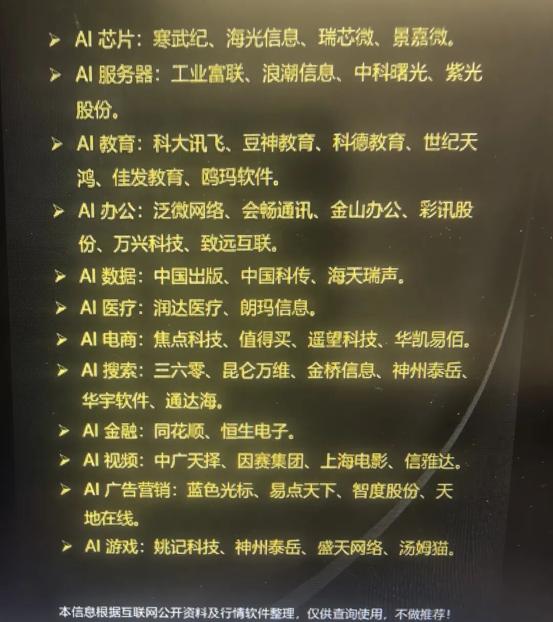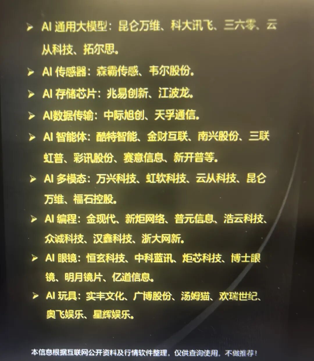 创新筑基:夯实人工智能赋能底座 ,强化人工智能算力供给。开发高水平行业模型。开展“模数共振”行动。 赋智升级:拓展推广高价值应用场景,加快重点行业应用赋能。加速全流程转型升级。提升重点企业应用水平。推进重点区域推广应用。推动重点领域智能化升级。 产品突破:构建智能新产品新业态 推动智能装备迭代 加速智能终端升级。打造智能体新业态。 主体培育:打造人工智能发展和赋能应用主力军,梯次培育企业。打造创新载体。发展赋能应用服务商。 生态壮大:加强资源配置优化产业生态 ,强化标准引领。推动开源开放。加强人才引育。 安全护航:筑牢应用赋能安全保障,提升安全保障能力。建立安全治理机制。 国际合作:塑造国际合作竞争新优势,支持产业合作。打造国际合作平台。建立部门合作、央地联动、产业协同的工作推进机制,鼓励地方因地制宜制定政策措施,引导企业错位发展,防范产业“内卷式”竞争。统筹现有资金渠道,布局支持“人工智能+制造”有关技术研发和赋能应用任务。发挥国家人工智能产业投资基金作用,丰富优质项目储备,吸引带动更多社会资本有序加大投资。开展新技术新产品新场景大规模应用示范行动,用好首台(套)、首批次、首版次应用政策,推进新技术、新产品的推广应用和迭代升级,释放国内市场需求潜力。开展人工智能产业规模测算,建立应用监测评价指标体系,完善人工智能产业监测分析平台,动态监测全球产业发展态势。 实施意见通篇看来,从人工智能底层基础算力,模型,行业标准,数据支持出发。到行业赋能,推动转型升级,从研发 ,中实验,生产制造,营销环节运营全流程指导。定位应为场景,推动人工智能与工业互联网平台融合赋能。深入应用。提出智能产品AI应用 AI终端 AI智能体。强化资源,推动开源,人才培养,安全推动。支持国际合作最后全方位政策支持保障。 回到主题,既然国家大力支持发展AI+制造。那结合资本市场,是否能成为2026年牛市主线呢,我们回顾2025年的算力,CPO, 芯片,液冷,存储,无一例外都走出了一轮波澜壮阔的上涨,而回顾AI,去年DEEPSEEK 横空出世后,上涨了两个月后基本都在下半年进入了长期横盘整理阶段,其中还不乏受到唱空AI泡沫的言论打压。到后来的SORA, kimi,豆包,千问 。其实还是有不少关于人工智能的主题机会。包括近期巴菲特开始买入谷歌。作为科技老大的再次被股神关注。笔者相信AI+一定会成为全年的牛市旗手,后面也会随着AI 的不断升级,迭代,不管国内还是国外的 AI巨头都会加大投资和发展。 我们再回到显示,现在中美都再AI发展上开始竞争,论创新美国确实领先,但在应用和基础设施方面我们会领先,2025AI集中在硬件,2026,资本市场协同与产品助力行情向AI应用却换。质谱和 MINIMAX上市后大涨,也标志这行业从烧钱研发进入到价值兑现阶段。AI4S 和马斯克X开源助推GEO爆发 。蚂蚁阿福也是阿里下场 AI医疗。中国信通院预测,2027年智能终端、智能体等应用普及率将超70%,这意味着2026-2027年将是应用渗透率快速提升的关键时期。高景气度叠加广阔成长空间,使AI+应用领域具备长期投资价值,也符合资本市场对高成长主线的追逐需求。最后回到A股,那股市的投资机会又会回到哪些板块和个股呢?笔者也通过互联网工具整理了一下数据。涉及个股,供各位参考,不做推荐。欢迎大家私信交流 ,后台留言。
