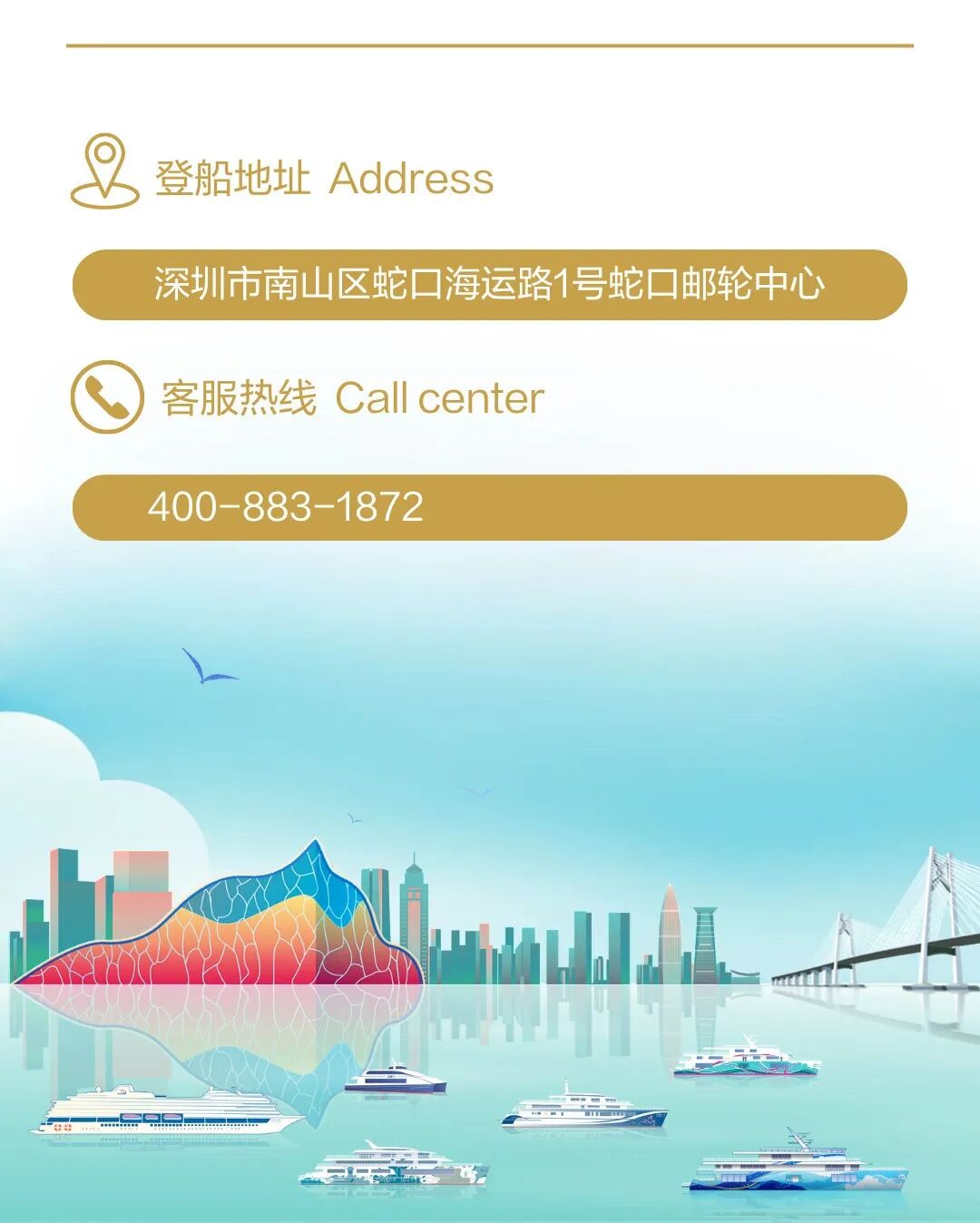 同时,深圳国际邮轮母港在南登录大厅综合服务柜台3号区域,设置专属服务柜台,提供场馆内香港国际机场预办值机、行李免费递送、售票及咨询服务。