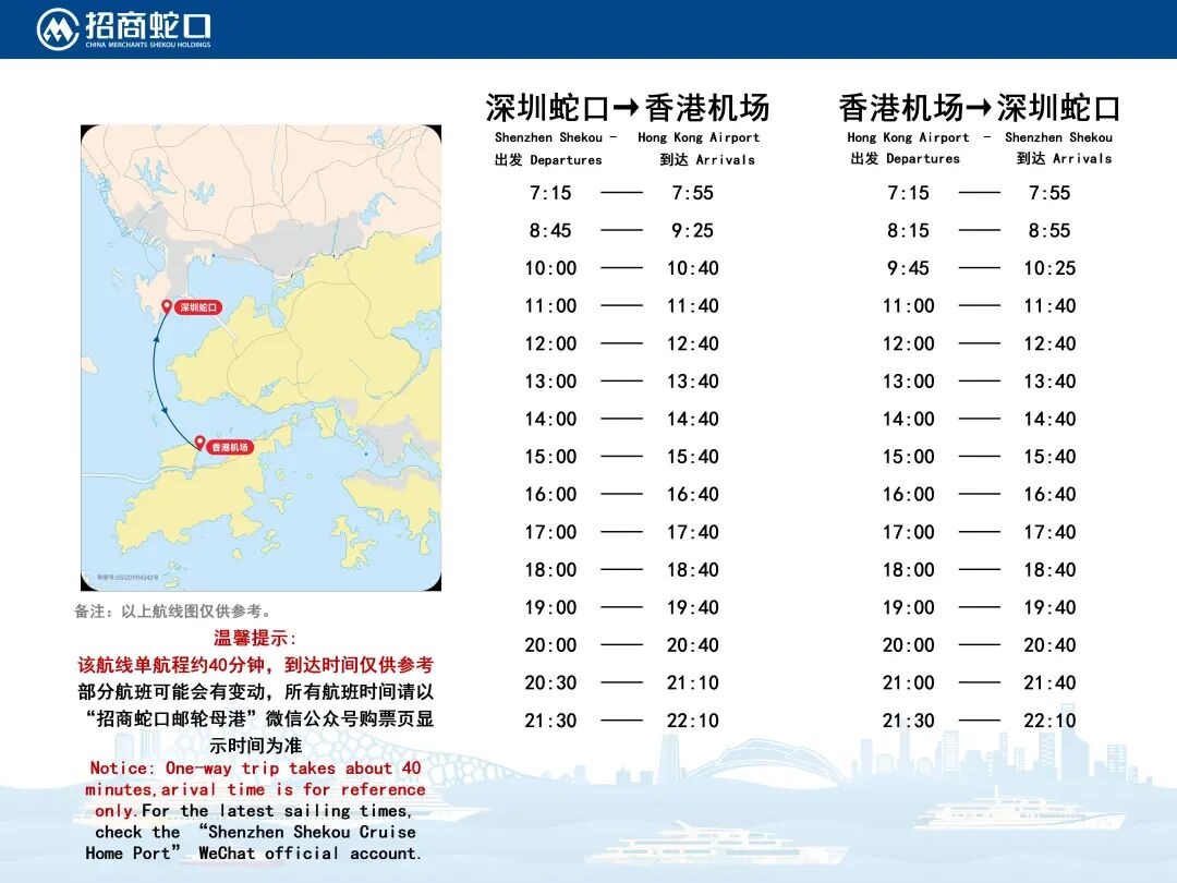 即日起加开2个船班,深圳蛇口出发加开21:30航次,香港机场出发加开07:15航次。11月15日起,香港机场航线船班调整为单程40分钟,20:45航次调整为20:30航次。