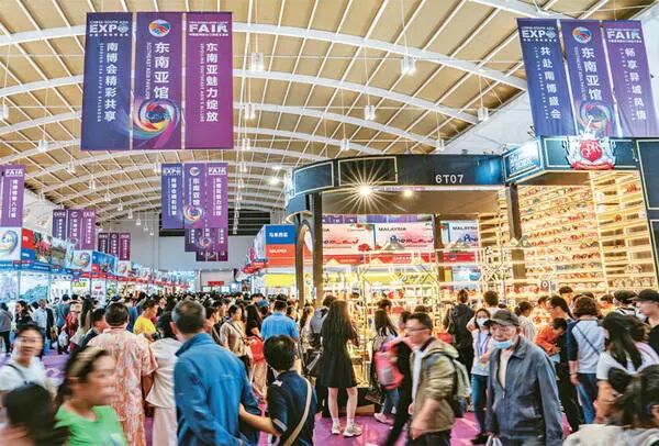 构建新发展格局,要实施更大范围、更宽领域、更深层次的对外开放。2025年6月19日至24日,第9届中国—南亚博览会在云南昆明举行。截至6月24日12时,博览会实际签约商贸合同项目153个,外贸合同金额达84.79亿元,入馆突破50万人次。图为闭幕当日拍摄的博览会东南亚馆。 新华社记者 胡超/摄
