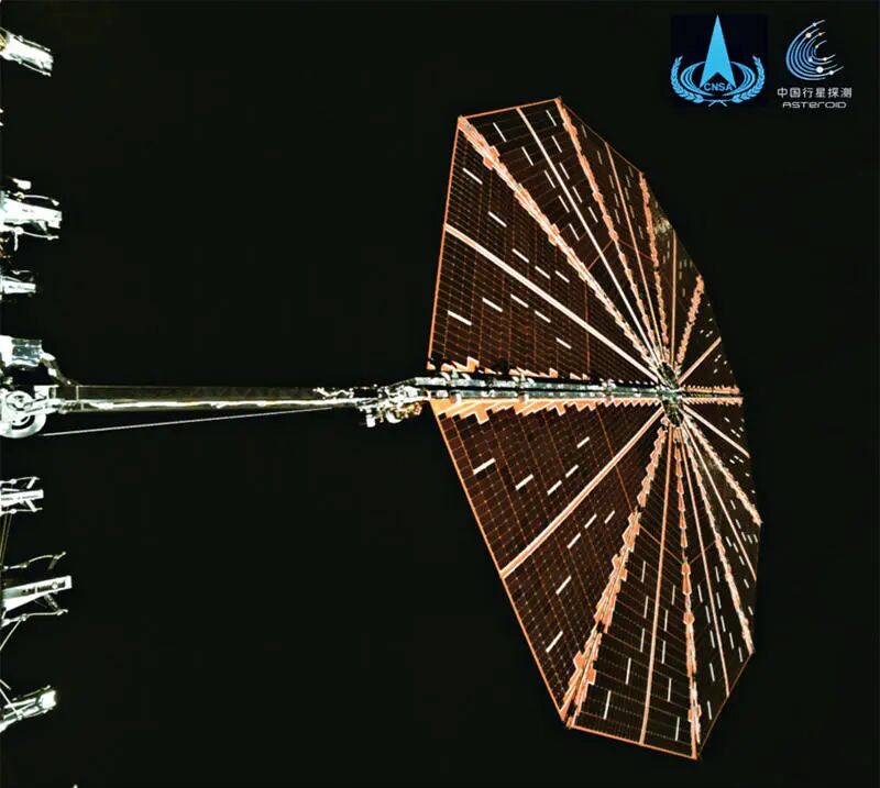 新时代以来,我国在基础前沿研究上不断实现新突破,在量子科技、生命科学、物质科学、空间科学等领域取得一批重大原创成果。2025年6月6日,国家航天局发布天问二号探测器传回的圆形太阳翼展开的图片。为满足在距离太阳约3.75亿千米的主带彗星开展探测的供电需求,天问二号探测器研发配置了圆形柔性太阳翼。图为监视相机拍摄的太阳翼完全展开后的姿态。 新华社发 国家航天局供图