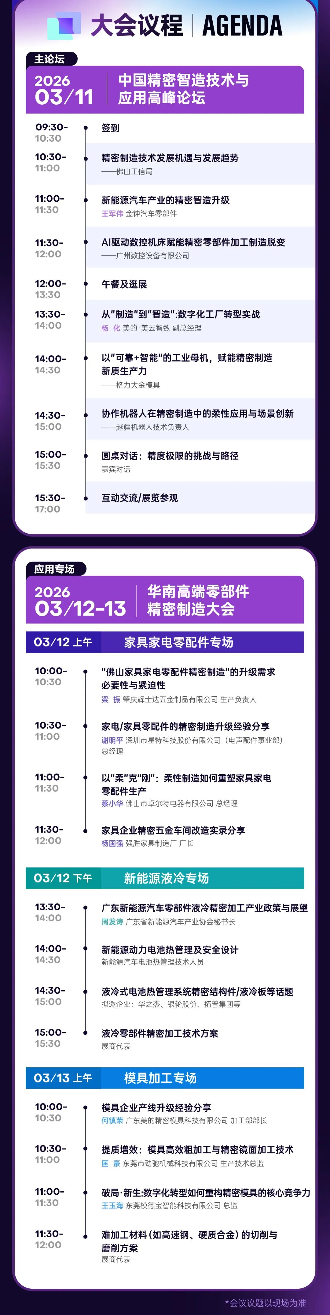 议程明确贯穿从宏观趋势(AI驱动、数字化工厂)到具体场景(柔性应用、产线改造)的转型逻辑,展现智能化、数字化技术如何具体赋能精密加工、质量控制与生产管理。
