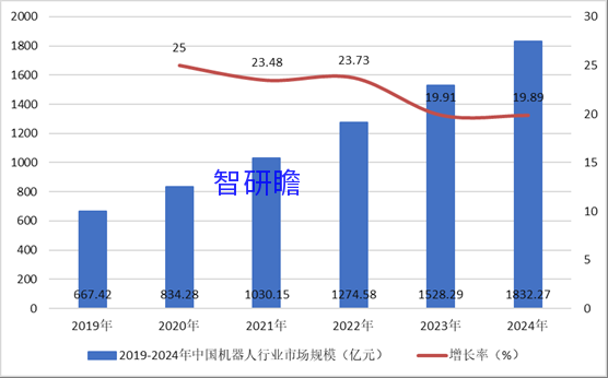 统计数据显示,2019年中国机器人行业市场规模667.42亿元,2024年中国机器人行业市场规模1832.27亿元。2019-2024年中国机器人行业市场规模如下: