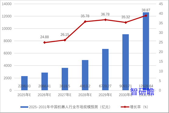 预测,受中国机器人行业市场需求的增长,2025-2031年中国机器人行业市场规模平稳上升。2031年中国机器人行业市场规模12628.64亿元。2025-2031年中国机器人行业市场规模预测如下:
