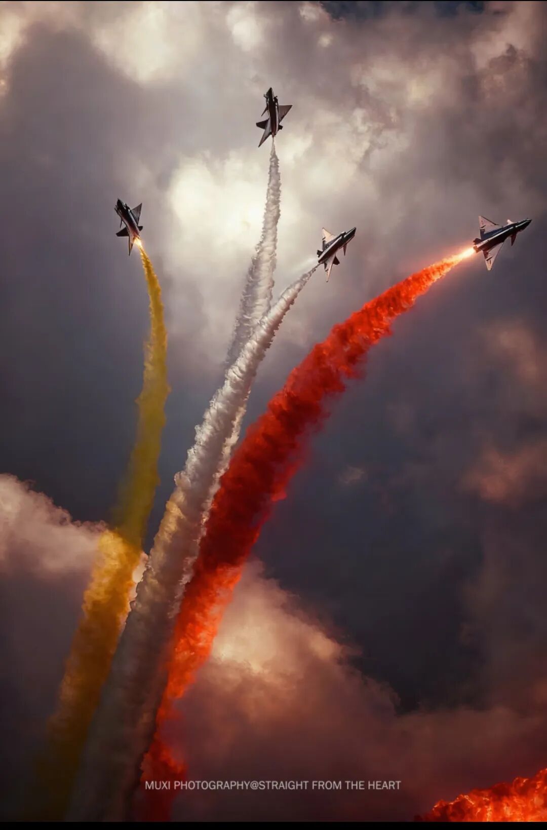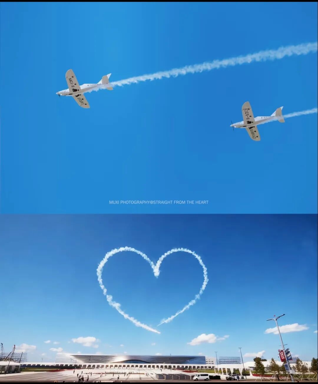 有一个细节,“红鹰”飞行表演队两架飞机快速向上拉起,在蓝天作画,绘出爱心形状。
