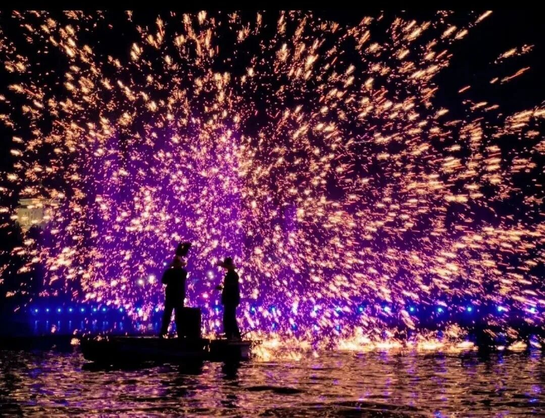 🔥打铁花更绝!1600℃的铁水被击向夜空,瞬间变成漫天“星光”,落在水面上还会折射出blingbling的光🔆,直接把浪漫拉满💝!