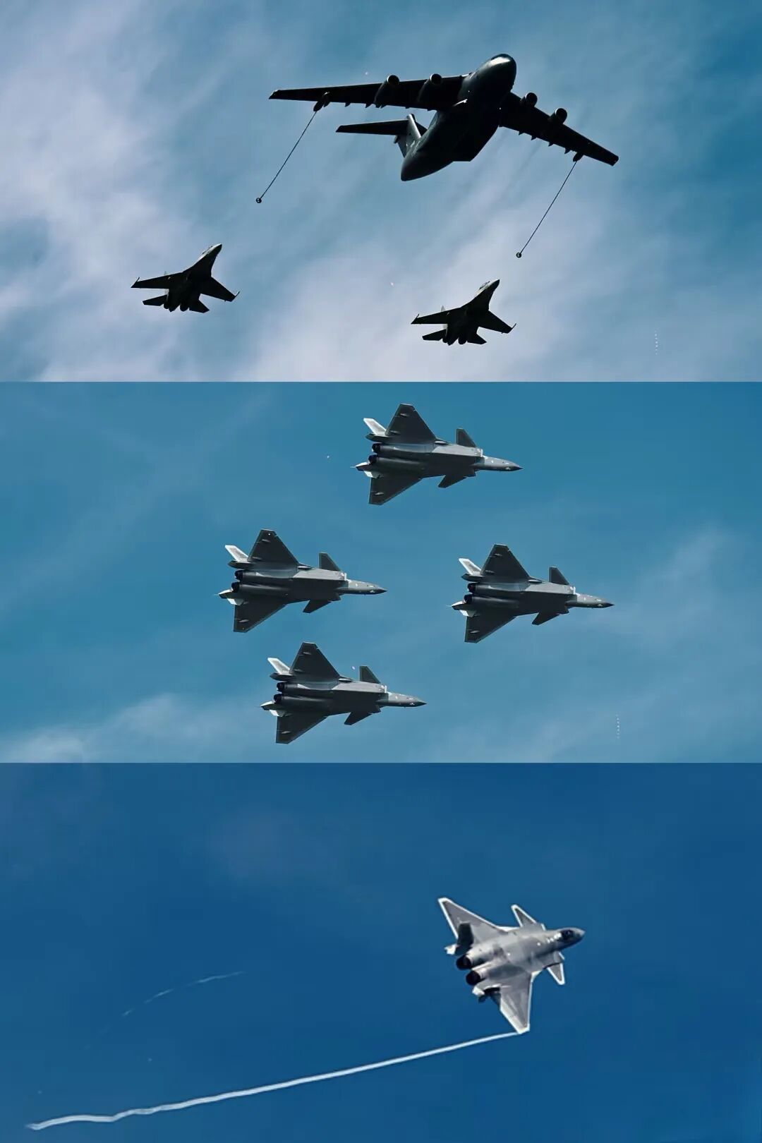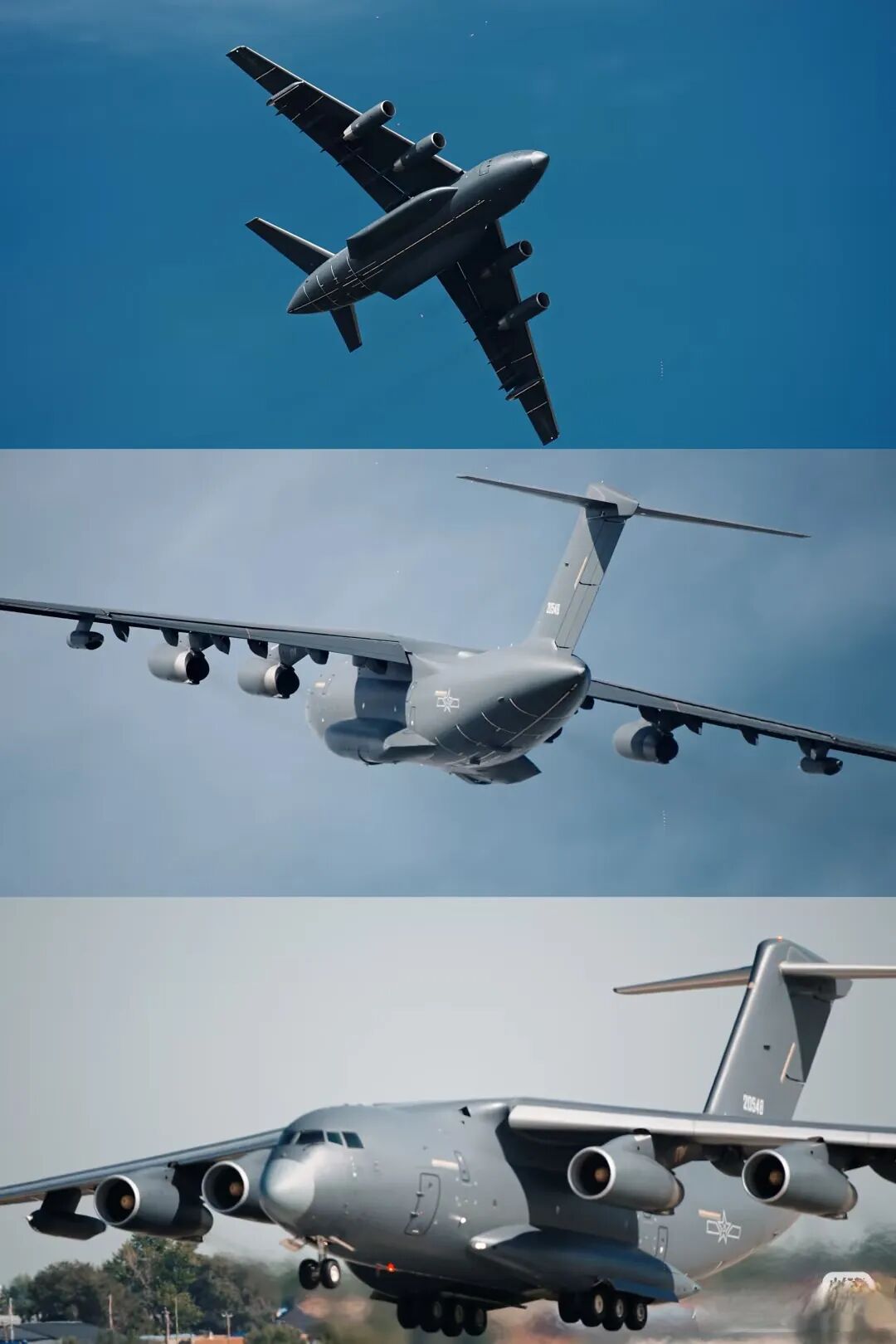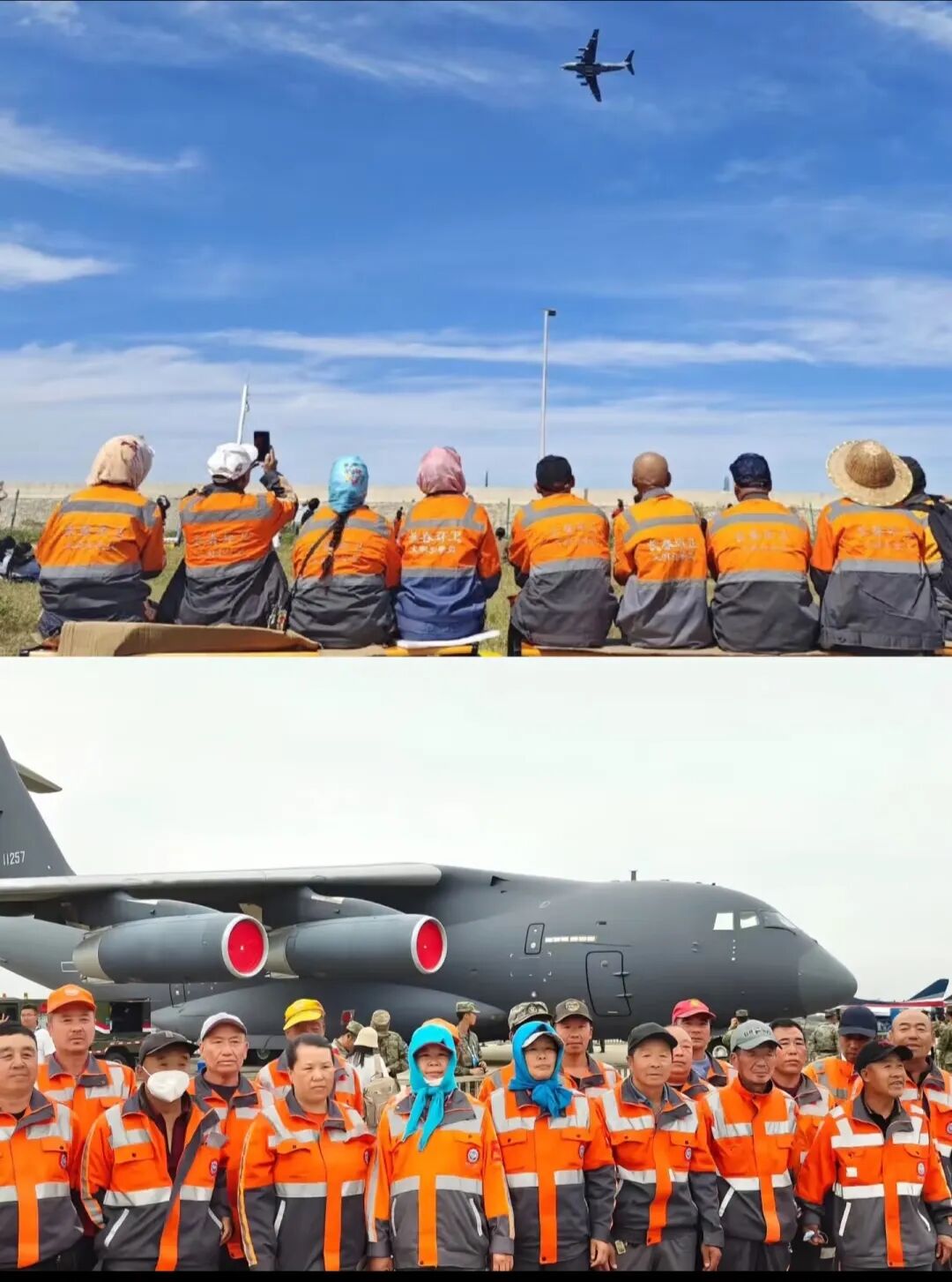 有一张图片是环卫工人坐在长椅上看运飞过,很感动,这就是我们的人民空军在向自己的人民展示他们的专业和强大,何其有幸,在蓝天之下,看国之重器耀舞长空,祖国盛世!