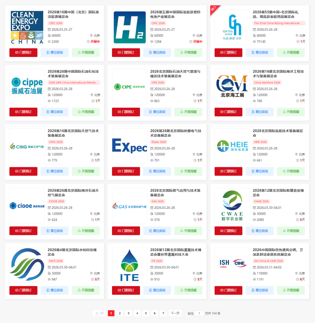 2026年3-12月北京将举办多场重要的展会活动,涵盖了氢能、能源、礼品、石油、管材、天然气、建筑工程、氢能、能源、电机、石油、农业、水利、智能家居、能源、家具、制冷、花卉、珠宝、茶叶、汽车、声学、茶叶、加盟、食品、广告、餐饮、文化、教育、工业、环保、保健、园林、健康、汽车、文化、电力展等多个领域。小编为大家整理了3-12月北京展会排期表,希望能帮助你规划行程。文中获取2026年3-12月北京展会门票/展位预约入口~(大多门票限时免费)