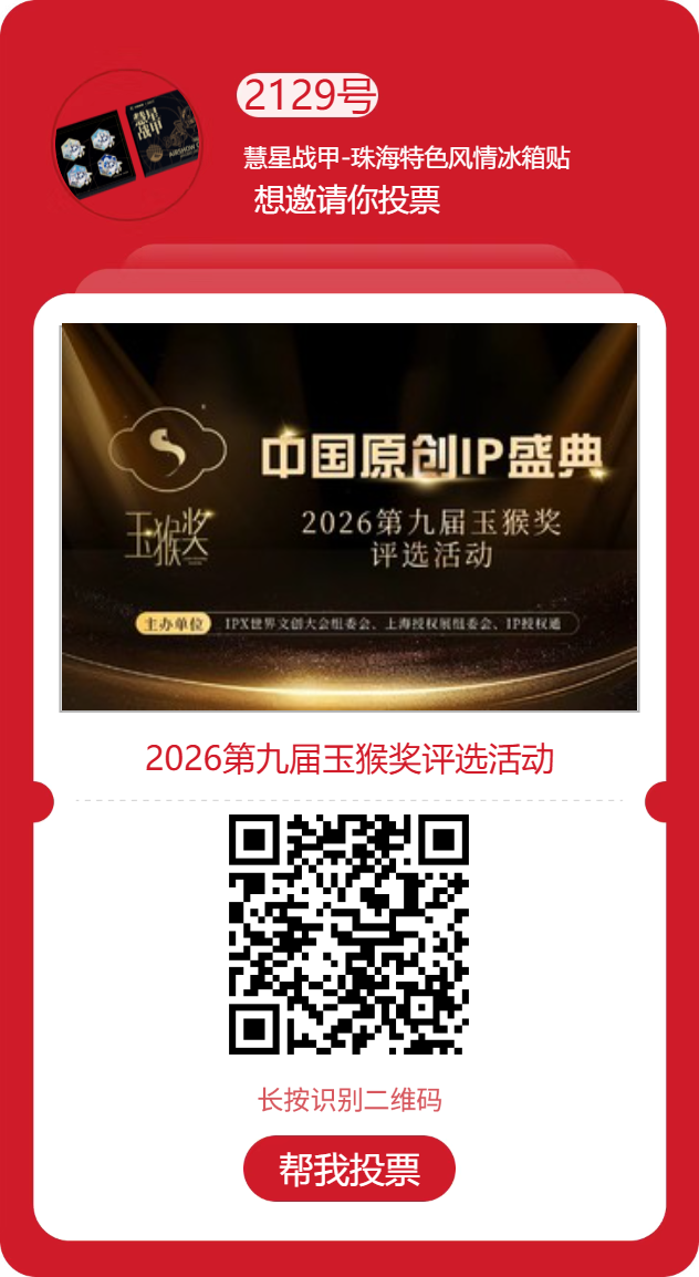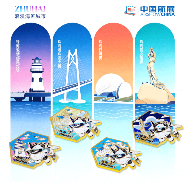 基于中国航展吉祥物星宝机甲新造型,融合港珠澳大桥、日月贝、珠海渔女和爱情邮局等珠海特色地标景点,开发了该系列冰箱贴。其巧妙将中国航展IP与珠海标志性文旅符号结合,既承载着中国航展的科技硬核气质,又饱含珠海的城市风情,形制精巧、寓意深远,是兼具纪念价值与收藏意义的文旅佳品。