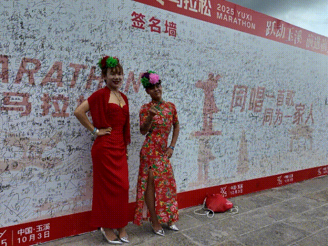 领完参赛物品后,在马拉松博览会现场,记不清楚是第几次遇见了来自云南省红河哈尼族彝族自治州弥勒市的两男两女,其中两位穿着旗袍的男性小伙子特别惹眼。男人穿成这样,估计女人都会自惭形秽。