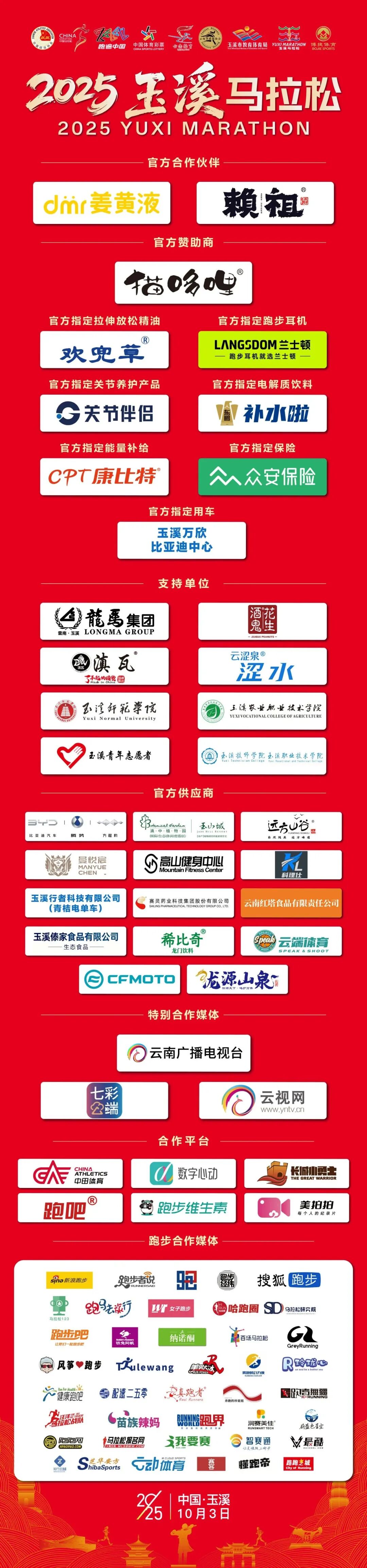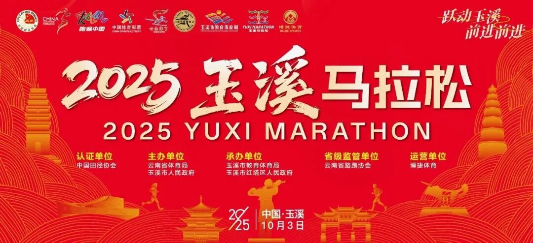2025玉溪马拉松赛,由中国田径协会认证(A1类),云南省体育局、玉溪市人民政府主办,玉溪市教育体育局、玉溪市红塔区人民政府承办,玉溪市文化和旅游局、玉溪市红塔区教育体育局协办,云南省路跑协会监管,四川博捷体育文化传播有限公司运营。