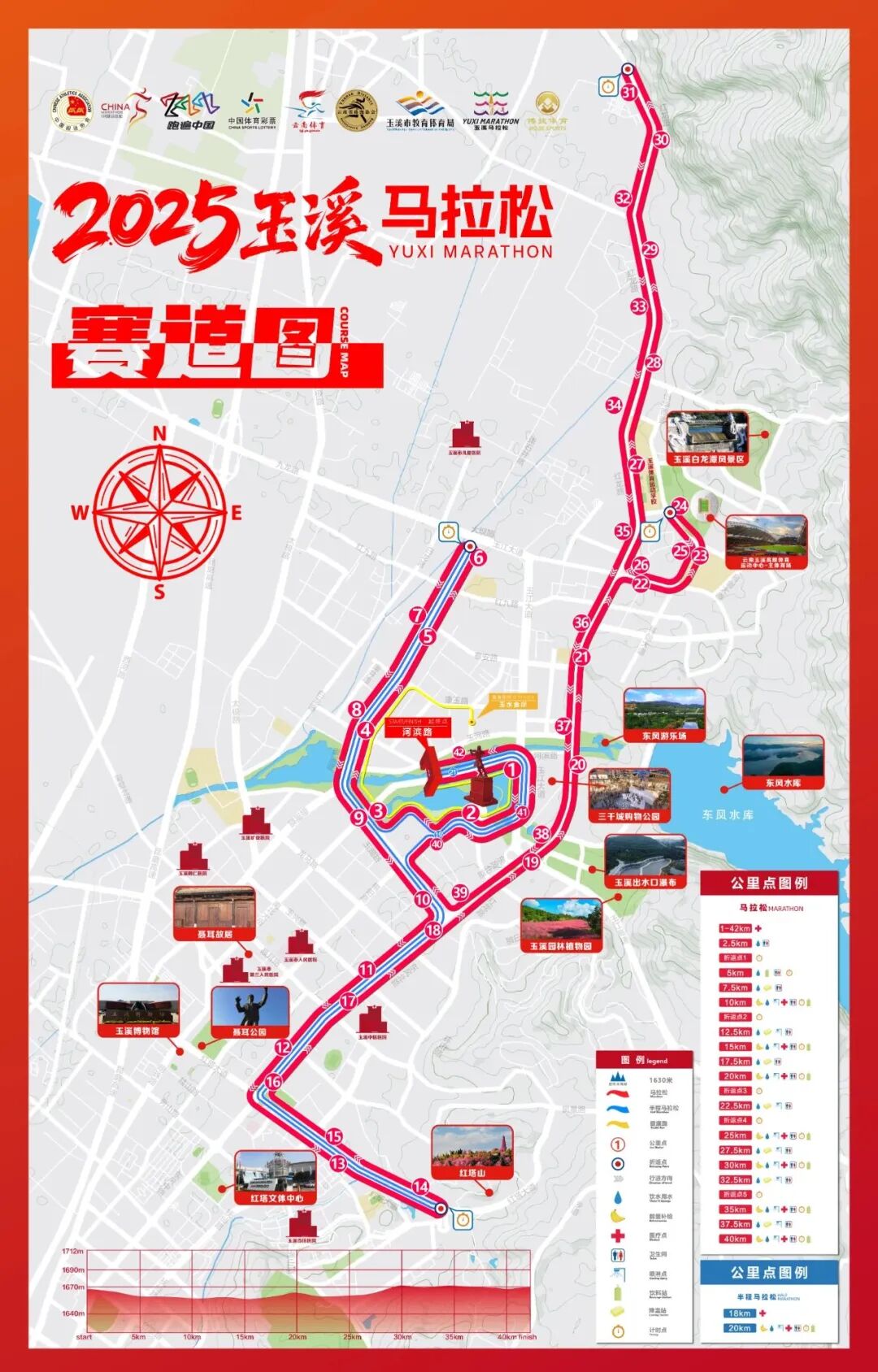 2025玉溪马拉松赛马拉松项目的选手,从河滨路出发,途经聂耳文化广场、聂耳公园、聂耳故居、玉溪博物馆、红塔山、玉溪园林植物园、玉溪出水口瀑布、三千城购物公园、东风游乐场、东风水库、云南玉溪高原体育运动中心、玉溪白龙潭风景区等玉溪标志性城市景观,全面展示玉溪城市建设成就、历史文化景观和独特自然风光,让选手多方面感受玉溪的城市魅力,一起游览沿途的美好风光。