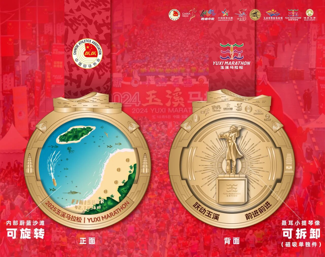 奖牌正面以抚仙湖为蓝本,呈现湖泊、岛屿、沙滩等元素,可旋转的设计复刻玉溪山水相依的生态画卷,传递城市宜居宜游的特质。背面,可拆卸的聂耳小提琴像,象征着玉溪这座城市对聂耳精神的传承与弘扬,呼应着马拉松赛事的拼搏精神,激励着每一位跑者在马拉松的赛道上,用坚定的步伐奏响属于自己的奋进乐章。