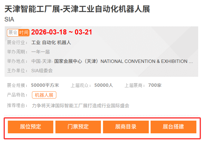 天津智能工厂展-天津工业自动化及机器人展(SIA)涵盖了工业自动化、金属成型、工业机器人、智能制造、3C电子装备和智能工厂等领域的工业装备,为整个华北地区陶瓷家电、3C电子、化工、建材五金、铸造、机械等领域制造企业提供先进技术解决方案,以促进创新产业升级。