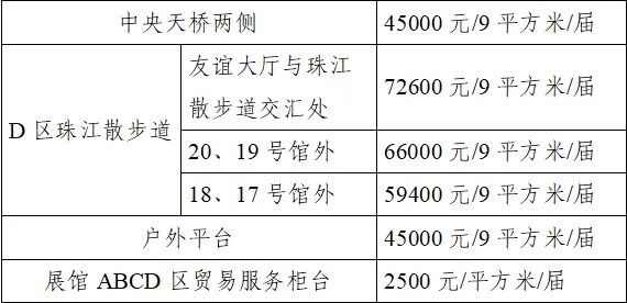 中央天桥西侧全部为统一风格样式标摊,由大会服务商设计搭建。珠江散步道、户外平台全部为光地,其中珠江散步道最小申请面积为18平方米,户外平台最小申请面积为54平方米,由贸易配套服务单位自行委托广交会特装施工服务商进行特装搭建。贸易服务柜台由贸易配套服务单位自行委托广交会特装施工服务商进行简单装饰布置。