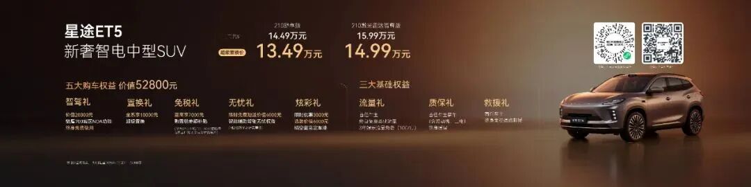 作为本届星途展台的焦点,「新奢智电中型SUV」星途ET5已于11月28日在珠海上市,新车带来210舒享版、210激光雷达智尊版两个款型,官方指导价为14.49万元-15.99万元,超级置换价13.49万元-14.99万元以诚意满满的价格回馈用户,并重磅宣布猎鹰700城区NOA功能终身免费使用。价值52800元五大购车权益、三大基础权益下定即享。
