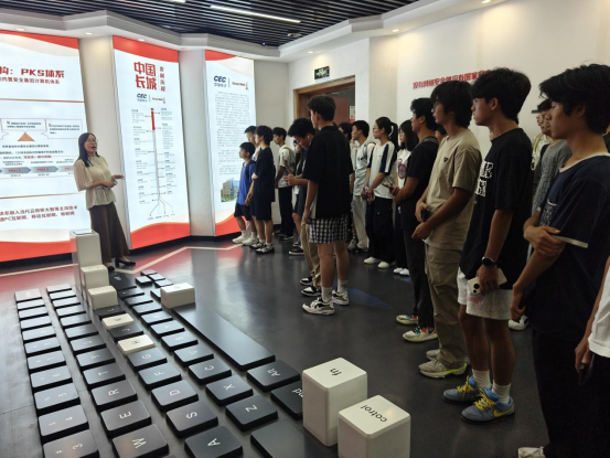 在浙江长城总经理陈秀的热情接待下,同学们首先参观了浙江长城智能展示中心。通过详尽的讲解,大家系统了解了中国长城科技集团的发展历程、核心技术突破及在网信产业中取得的辉煌成就。从自主安全的计算硬件到完整的网信产业生态,展厅内陈列的一系列产品深深吸引了同学们的目光,让大家对国产计算机的技术实力与发展成就有了直观而深刻的认识。
