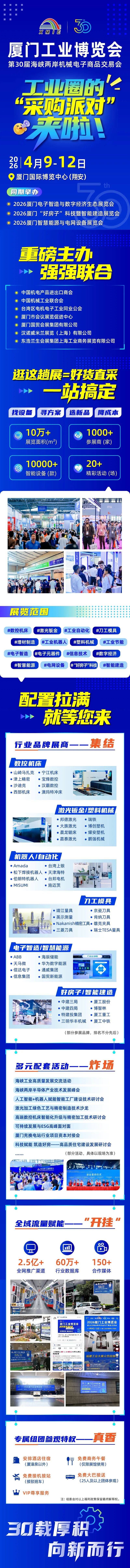 2026年4月9日至12日,厦门工业博览会暨海峡两岸机械电子商品交易会(厦门工博会)将在厦门国际博览中心(翔安)盛大举行。本届展会规模达10万平方米,汇聚350余家商协会,预计吸引11万人次观展及超2.5亿次媒体曝光。聚焦金属加工与智能制造等前沿领域,展会以“资源、技术、商机一站配齐”为理念,通过展览展示与供需对接,全力构建数智化全产业链生态平台。