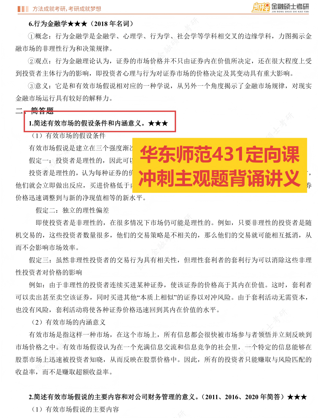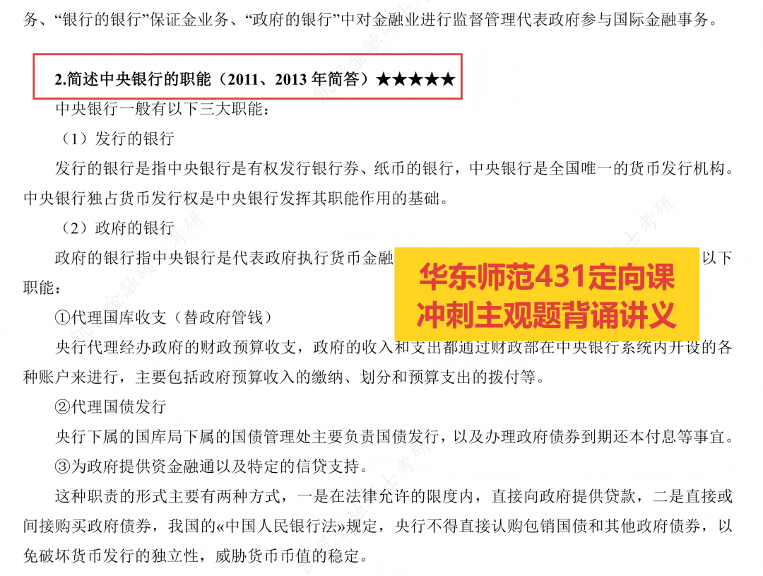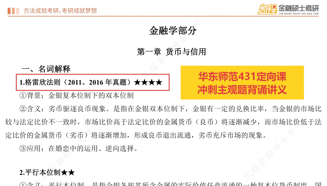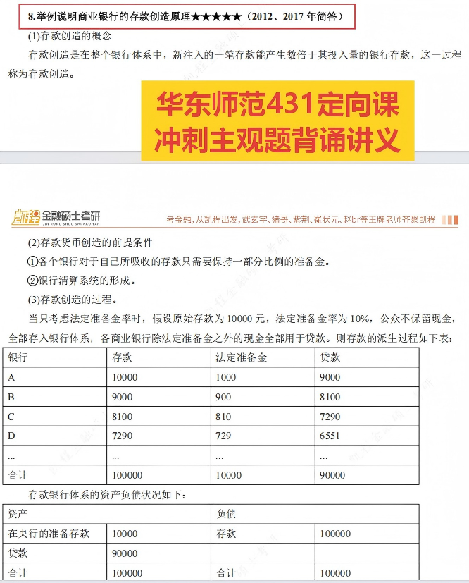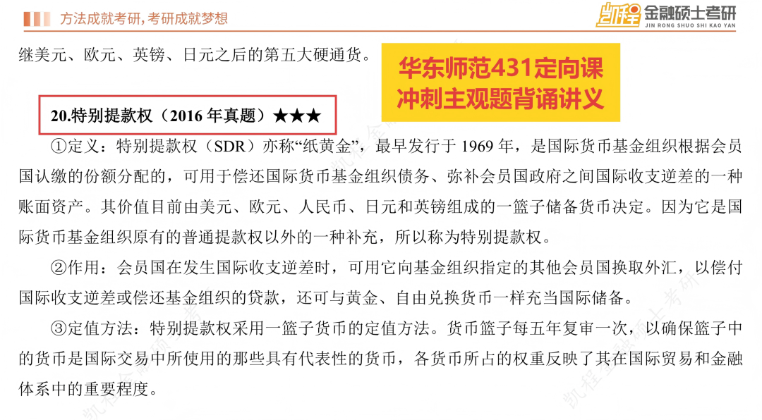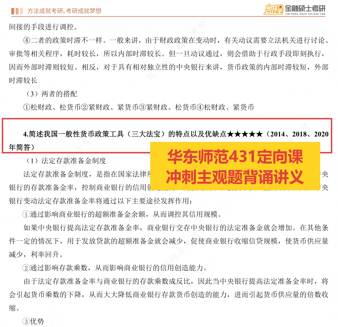 一、今年命题特点和难度:1.主观题分值比重较去年再度提高,对基础知识的背诵要求更高去年2025年考研调整了题型和分值,整体变化是主观题从110分提高到120分,同时简答题和名词解释的单题分值提高,减少了计算题的题量,对主观题的背诵要求提高。今年延续去年的真题改革思想,进一步缩减计算题题量,从3道降为2道,单题分值从10分提升至12分,论述题单题分值从12分提高至14分,此番调整,使得主观题总分从120分提高至126分,不难看出,近几年的出题趋势就是增加主观题的分值,对计算题的考查要求降低,要求考生立足于课本、课程中的基础知识,加强主观题理解背诵能力,这也是未来的出题趋势。从今年试卷整体难度上来看,自去年进行题型改革后,难度再下一个阶梯,超过九成的题目均能在基础/强化/冲刺课程中能找到出处,与课件 “主观冲刺背诵手册”、“基础/冲刺课程课件” 的训练重点高度契合,直接考查对核心知识点的记忆与整合能力。今年考查到的热点部分“稳定币”也是武玄宇老师课程中提到的今年重要热点,并且在学长的主观题复习预测课中也着重强调了该热点考查概率较大。所以,对于基础知识的整体把握,决定了九成的分数,对于热点内容的掌握,有武玄宇老师的保驾护航,答题也会轻松很多。今年的真题重复率非常之高,名词解释中除了信用风险、简答题除了货币局制度之外,均为历年真题重复考查,计算题难度更是创造历史新低,论述题均为原题或者今年重要热点考查,且这些题目均在主观题背诵讲义中能找到出处,所以今年简答题的题目较为简单且重复率高,但还是需要考生一定要吃透真题,结合主观题背诵讲义,熟练掌握一些简答题的答题技巧,能够结合热点进行展开,会得到不错的分数。去年论述题没有考查严格意义的热点知识,今年论述题“稳定币对国际货币体系的影响” 虽涉及热点延伸,但核心考点(国际货币体系构成、汇率制度变革)均来自课件 “国际收支”“外汇与汇率” 章节,体现 “基础理论 + 热点应用” 的命题思路。热点内容的考查核心就是理论+实际,考生在理论掌握的同时,需要结合武玄宇老师热点课程,掌握理论结合实际的答题方法和答题要素,同时结合自己平时的金融素养和素材的积累进行作答,这是论述题考查的趋势。 二、难度评估:整体偏易,梯度清晰,与课程适配度极高真题整体难度处于偏易水平,与课程课件的难度设置完全匹配,对紧跟课程节奏的考生友好。名词解释和简答题均为课件明确标注的核心考点(如“劣币驱逐良币”“凯恩斯货币需求理论”等),直接可从 “主观冲刺背诵手册” 中提取答案,难度低。计算题聚焦 CAPM 模型应用、NPV 计算,均是 “风险与收益”“资本预算” 章节的基础题型,计算过程无复杂推导,仅需掌握课件例题的解题逻辑即可得分,难度中等。论述题需结合理论与热点,但核心论点(存款货币创造机制、资本市场有效性)均在课件中有专题讲解,稳定币的考查仅需结合武玄宇老师热点课程适度拓展,难度中等偏上。整体来看,真题难度呈现 “低 - 中 - 高” 合理梯度,扎实掌握课件内容的考生可轻松突破 130 分。通过逐题比对真题与凯程课程课件,得出关键数据:真题考点与课件内容的重合率极高,具体来看:名词解释6 道题全部来自 “主观冲刺背诵手册”;简答题 6 道题均是课件章节重点简答题原型;计算题 2 道题是 “风险与收益”“资本预算” 章节的例题改编;论述题 3 道题的核心理论框架均来自课件专题讲解(存款创造、有效市场、国际货币体系)。充分证明课程课件对真题的预判性极强,核心考点完全命中。第一,围绕参考教材,打牢基础,尤其是宏观部分。今年的考题九成以上均来自课程中反复提到的重点知识点和重要考点,且主观题考查的比重再次上升,符合考前的整体预测,对于基础题+中档题的把握,决定了专业课分数的高低。所有题型均未出现超纲知识点,基础讲义、主观题背诵讲义+上课的课件涵盖了今年所有的考点,所以脚踏实地跟着课程学习,打牢基础,今年分数预计不会低于130分。第二,反复强调真题的重要性,吃透真题,整理好错题笔记,对于主观题,需要多记忆框架,反复练习,对于计算题,对于不同专题比如资本预算、风险与收益、资本成本等,展开专题突破,掌握计算原理,多做题,降低错误率,注意计算题考查的细节处理。第三,培养好金融素养,关心金融市场、资本市场、国内外政策的大事,可以为论述题积累素材和语料。最后,就是提前准备专业课的复习,专业课的学习是一个相对周期长的过程,想要打好基础,需要提前准备,才能获得不错的分数。