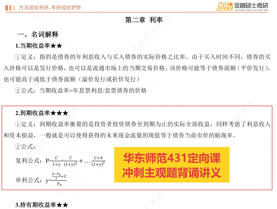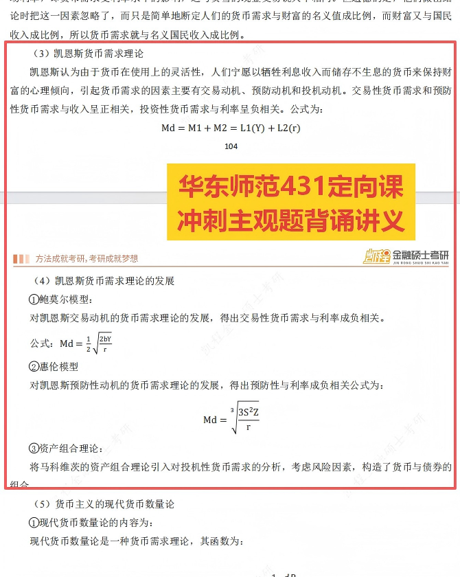 (2)含义:劣币驱逐良币现象。是指在金银双本位制下,金银有一定的兑换比率,当金银的市场比较与法定比价不一致时,市场比价高于法定比价的金属货币(良币)将逐渐减少,而市场比价低于法定比价的金属货币(劣币)将逐渐增加,形成良币退出流通,劣币充斥市场的现象。(1)定义:到期收益率衡量的是投资者投资债券至到期为止的实际全部收益,同样考虑了利息收入和资本损益,一般就是可以使得获得的未来现金流量的现值等于债券当前市价的贴现率。(3)与债券价格的关系:到期收益率(YTM)与债券市场价格呈反向变动关系。市场利率上升,现有债券的价格下跌,其YTM上升(以吸引新买家);反之,市场利率下降,债券价格上涨,其YTM下降。(1)概念:远期外汇交易又称为期汇交易。是由外汇买卖双方签订合同,交易双方无需立即支付对应货币,而是约定在将来一定时期内,按照预先约定的汇率、币种、金额、日期、地点进行交割的外汇业务活动。(2)特点:远期外汇交易与即期外汇交易的根本区别在于交割日不同。凡是交割日在成交两个营业日以后的外汇交易均属于远期外汇交易。(3)主要应用:企业进行远期交易的首要目的是进行套期保值,用于管理汇率风险,帮助其消除经营活动中的汇率不确定性,同时也为投资者提供了投机和套利的工具。(1)定义:特别提款权(SDR)亦称“纸黄金”,最早发行于1969年,是国际货币基金组织根据会员国认缴的份额分配的,可用于偿还国际货币基金组织债务、弥补会员国政府之间国际收支逆差的一种账面资产。其价值目前由美元、欧元、人民币、日元和英镑组成的一篮子储备货币决定。因为它是国际货币基金组织原有的普通提款权以外的一种补充,所以称为特别提款权。(2)作用:会员国在发生国际收支逆差时,可用它向基金组织指定的其他会员国换取外汇,以偿付国际收支逆差或偿还基金组织的贷款,还可与黄金、自由兑换货币一样充当国际储备。(3)定值方法:特别提款权采用一篮子货币的定值方法。货币篮子每五年复审一次,以确保篮子中的货币是国际交易中所使用的那些具有代表性的货币,各货币所占的权重反映了其在国际贸易和金融体系中的重要程度。(1)概念:信用风险又称违约风险,是指借款人、证券发行人或交易对方因种种原因,不愿或无力履行合同条件而构成违约,致使银行、投资者或交易对方遭受损失的可能性。(2)特征:信用风险具有不对称性、累积性、非系统性、内源性的特征。(3)产生来源:信用风险的产生主要源于债务人的偿债能力和偿债意愿。(4)与利率之间的关系:利率的风险结构理论提到,在债券期限条件相同的情况下,债券发行人的信用风险(违约风险)越高,债券投资人会要求更高的信用利差(即风险溢价)来补偿承担的信用风险。即信用风险越高,利率或收益率要求就越高。(2)内容:由两部分组成:用资费用和筹资费用。前者主要指向债权人支付的利息、向股东分配的股利等,后者主要指向银行支付的借款手续费,因发行股票、债券而支付的发行费用等。B.评价投资项目、比较投资方案和进行投资决策的经济标准发行的银行是指中央银行是有权发行银行券、纸币的银行,中央银行是全国唯一的货币发行机构。中央银行独占货币发行权是中央银行发挥其职能作用的基础。政府的银行指中央银行是代表政府执行货币金融政策的机构。作为政府的银行,它主要执行以下职能:①代理国库收支(替政府管钱)、②代理国债发行、③为政府提供资金融通以及特定的信贷支持、④替政府管理外汇储备、⑤制定和实施货币政策、⑥制定并监督执行相关金融管理法规、⑦代表政府参加国际金融活动,进行国际金融事务的协调与磋商。中央银行作为银行的银行,是指其与商业银行和其他金融机构的特殊业务关系,这种特殊业务关系主要体现在以下三个方面:商业银行和有关金融机构必须向央行存入一部分存款准备金,目的一是保证存款机构的清偿能力,二是有利于央行调节信用规模和货币供给。中央银行作为最后贷款人,是指对商业银行和其他金融机构融通资金。特别是当发生金融危机时,其他银行无力或不愿意对一些银行贷款时,中央银行能够而且愿意提供这些资金。作为全国的票据清算中心,中央银行可以为各银行和其他金融机构间的货币的收付转账提供快捷便利的服务,解决单个银行的清算困难,可以加快资金的周转速度,同时便于中央银行掌握商业银行的经营状况,便于实施经营。【题目溯源】华东师范431考前冲刺主观题背诵讲义、华东师范431VIP拔高课凯恩斯认为,人们之所以需要持有货币,是因为存在流动性偏好这种普遍的心理倾向。所谓流动性偏好,是指公众愿意用货币形式持有收入和财富的欲望和心理,这种愿望构成对货币的需求。因此,凯恩斯的货币需求理论被称为流动性偏好理论。人们的货币需求源于以下三种动机:交易动机、预防动机和投机动机。是指人们为了日常交易的方便,而在手头保留一部分货币,基于交易性动机而产生的货币需求就被称为货币的交易需求。它取决于收入的数量和收支的时距长短,由于收支的时距在短期内相对稳定,因此这类支出会受到收入水平的影响,因此交易动机下的货币需求是收入水平的增函数。又称谨慎动机,是指人们需要保留一部分货币以备未曾预料的支付。凯恩斯认为,人们因谨慎动机而