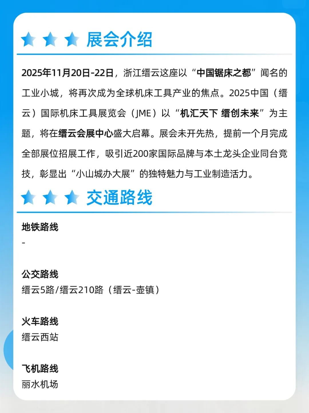 2025年11月20日-22日,浙江缙云这座以“中国锯床之都”闻名的工业小城,将再次成为全球机床工具产业的焦点。2025中国(缙云)国际机床工具展览会(JME)以“机汇天下 缙创未来”为主题,将在缙云会展中心盛大启幕。