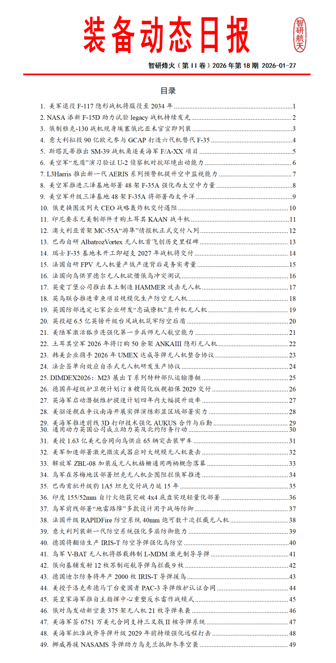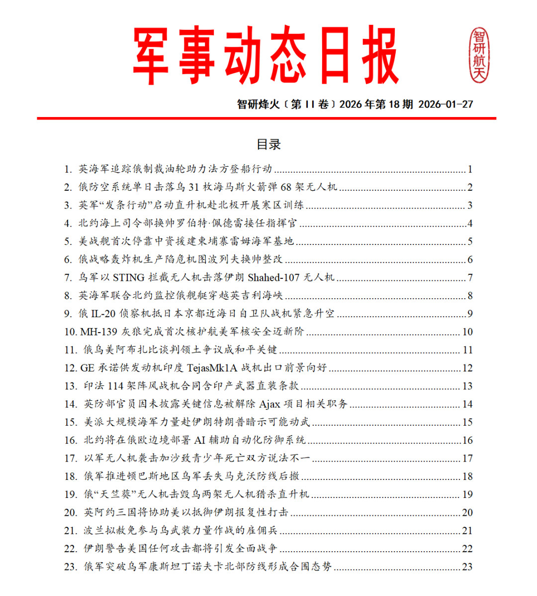 《全球防务动态》系列专刊国内独家每日发布涵盖航天领域、武器装备、军事热点、人工智能、先进制造等领域的全球动态信息。提供“航天动态专报”、“装备动态专报”、“军事动态专报”、“智造动态专报”以及“航天防务新闻日报”等特色产品模块。工作日每日推送,形成结构化、可编辑的文档,供订阅用户在小程序“智研烽火信息”商城下载。每日及时的动态信息能够有力支持各单位进行要讯报送、军情研究与安全形势分析的需求。