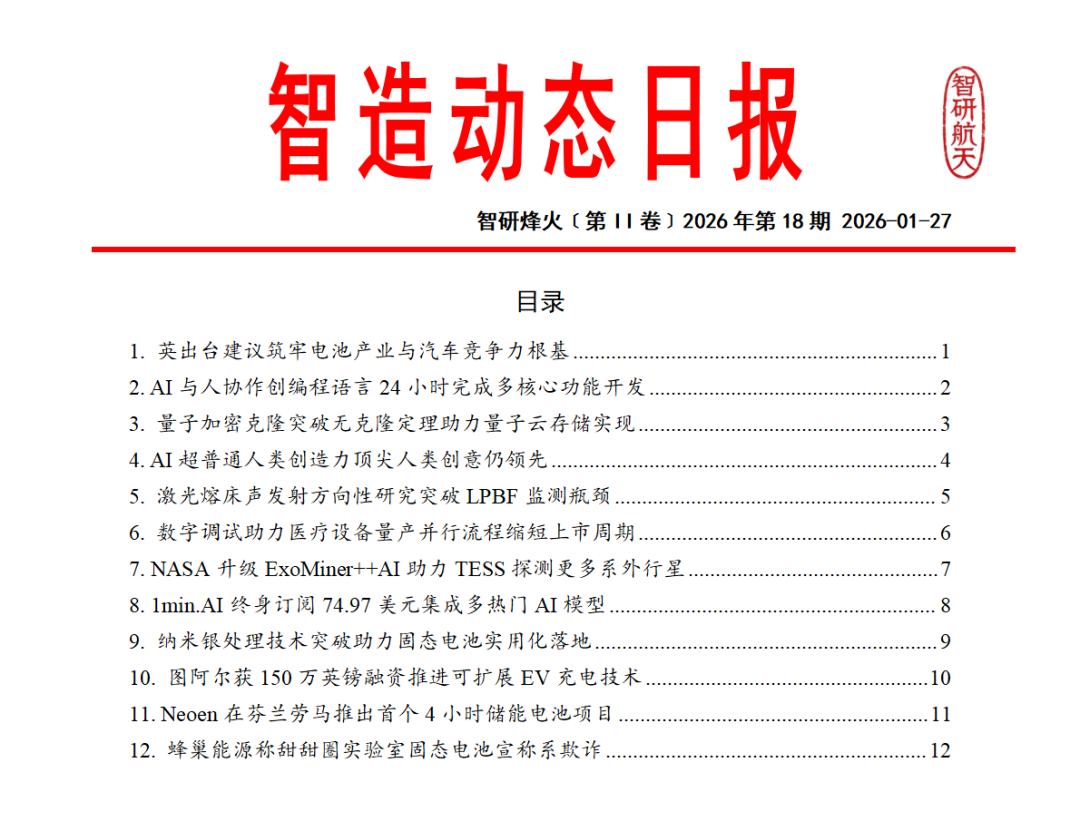聚焦全球智能制造领域的权威情报产品,每日精选航空技术与应用、人工智能、工业机器人、增材制造、芯片工艺等核心技术突破与产业动态,以结构化、可编辑的文档形式呈现。内容涵盖技术解析、企业战略及政策影响,依托资深专家团队及强大的开源情报处理能力,助力企业快速捕捉技术趋势与市场机遇,把握智造脉搏,引领产业升级。