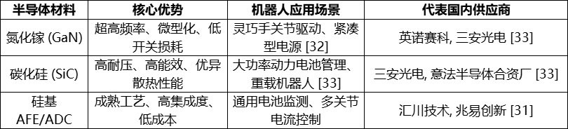 • 氮化镓(GaN):英诺赛科(Innoscience)的测试显示,在机器人关节驱动板中使用GaN器件,可使体积缩减约50%,并显著降低开关损耗,从而提升机器人的运动灵活性和续航能力 [32]。