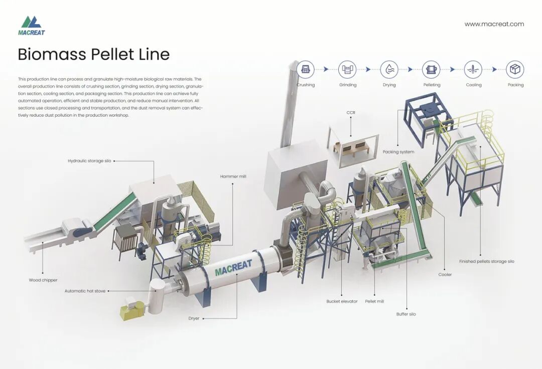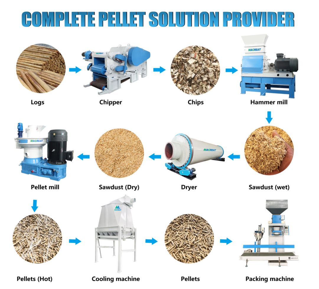 生物质颗粒生产线、木材削片机、木材破碎机、锤式破碎机、生物质颗粒机、干燥机、冷却机、木材剥皮机、自动包装机等。