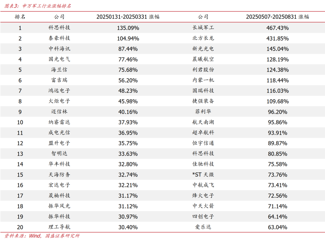 2025年5月印巴冲突展现了中国军工装备的高性能,军贸打开长期成长空间。根据观察者网,2025年5月巴空军驾驶中国产歼-10C战机,击落了包括“阵风”战机在内的多架印度现代化战机,展现了中国军工装备的高性能,也打开了军贸的长期成长空间。20250507至20250831申万军工板块涨幅高达46.02%,涨幅靠前标的也多是和军贸相关标的。