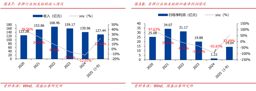 1、导弹:2025年板块订单逐步恢复,消耗属性+补库需求“十五五”有望迎来高增长。2023~2024年导弹产业链企业受行业影响经营面临困境,2023~2024年收入分别同比下滑5.51%、12.07%,归母净利润分别同比下滑36.21%、93.87%。2025年导弹产业订单已经开始逐步改善,公告新签合同的企业包括高德红外(20250722和20250805)、国科军工(20251030)等。我们认为导弹的消耗属性导致无论是训练还是补库需求仍然明显,未来3年有望实现高增长。