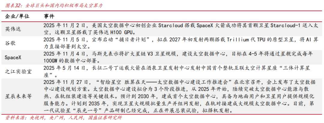 太空算力:海外巨头正在加速布局,国内政策驱动太空算力加速发展。在轨卫星数据量大,传统的“天数地算”受到卫星与地面站之间的带宽限制、窗口限制等严重影响。天基智能即把算力送上天,实现“天数地算”向“天数天算”转变,可以极大提高数据质量和效率,提升卫星数据应用潜力。2025年谷歌、英伟达、SpaceX等全球巨头均表明要大力发展太空算力。国内也在抓紧建设太空算力,其中2025年5月之江实验室将全球首个太空计算卫星星座“三体计算星座”送入700公里太阳同步轨道,11月27日北京发布了太空数据中心建设规划方案,国内太空算力有望迎来快速发展。