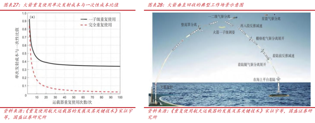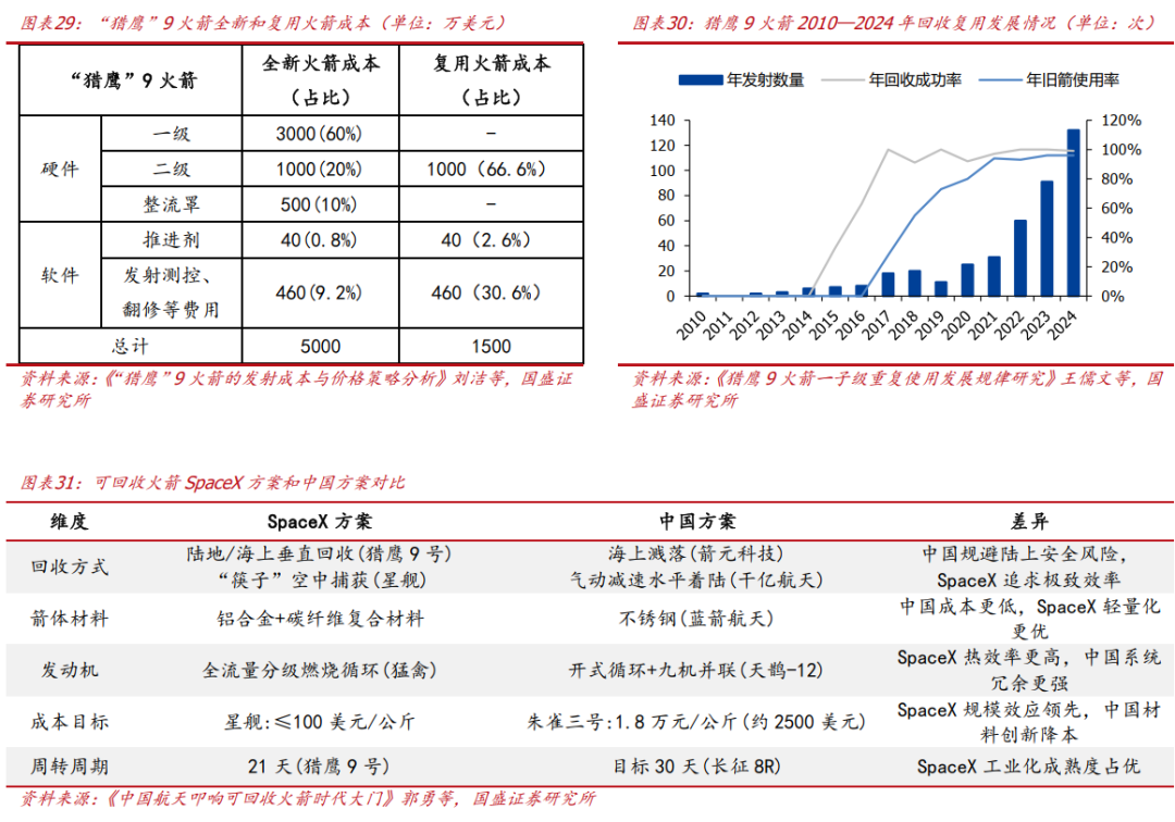 火箭:可回收火箭是满足大规模、高效益进出太空的前提条件,海外SpaceX技术已经十分成熟,我国仍处于加速追赶阶段。可回收火箭大幅降低了火箭发射成本,是实现大规模发射的必要条件,海外SpaceX用了不足10年的时间实现了“猎鹰”9火箭从首飞到一级回收、一级复用、整流罩回收和整流罩复用,有效提高了火箭一级和整流罩复用次数和效率并降低了回收成本,目前“猎鹰”9火箭年回收成功率和年旧箭使用率接近100%,复用火箭成本和全新火箭成本相比大幅下滑。虽然当下中国航天企业在可回收火箭方案成熟度上落后SpaceX,但是中国航天企业正以差异化技术路线竞逐可回收赛道,并且呈现“国家队”与民营企业齐头并进的格局。