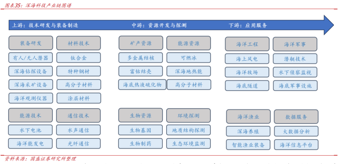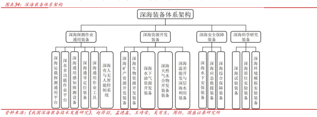深海科技产业链长,对于经济发展的驱动力巨大。深海科技上游是技术研发与装备制造,具体如UUV、材料技术、水下通信等;中下游是资源开发与探测,具体如矿产资源与能源资源的获取等;下游是应用服务,如海洋军事、海洋工程、海洋渔业等。我们判断,上游制造环节率先受益于深海科技建设,装备与技术成熟后赋能中游资源开发与探测,最终辐射至下游应用服务领域,成为驱动经济发展的重要组成部分。