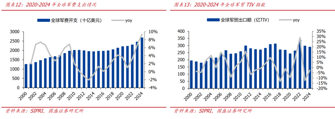 全球军费开支持续上行,地缘政治趋紧刺激全球装备交易量快速增长。2024年全球军费支出接近2.7万亿美元,同比增长9.36%,地缘紧张倒逼军费预算刚性上涨,牵引全球军贸产业蓬勃向上,2000年以来全球军贸TIV指数呈波动上升趋势,尤其是2022年俄乌冲突爆发后,当年军贸TIV指数达到338.71亿TIV,同比增长28.97%。