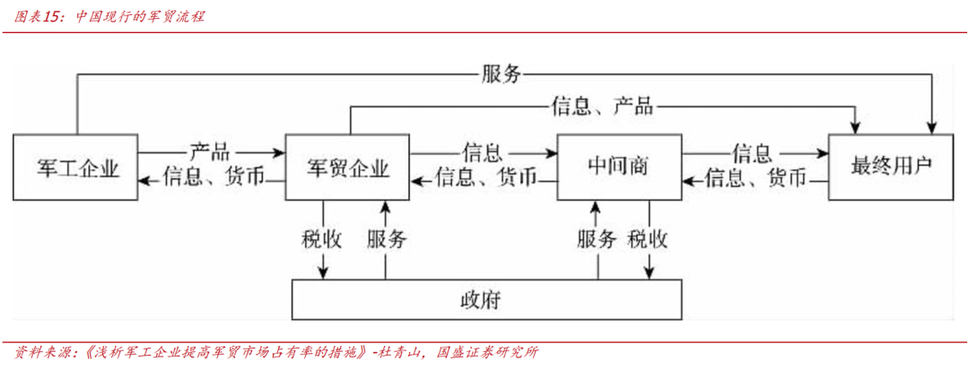 军贸出口流程:军贸出口市场主要包括生产单位(军工企业)、军贸公司、中间商三方,军工企业是军贸产品研发、生产、交付和售后服务的责任主体,军贸公司是依法取得军品出口经营权,并在核定的经营范围内从事军品出口经营活动的公司,是军品出口的唯一渠道。中间商是指依法取得用户国军品经营权,并在核定的经营范围内从事军品经营活动的公司。