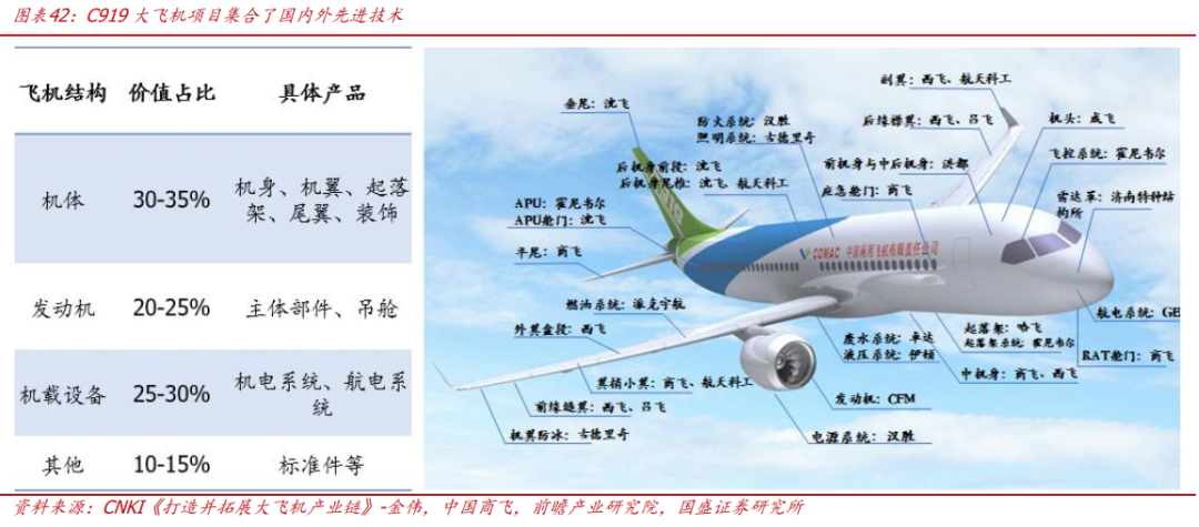 C919采用国际通用的“主制造商+供应商”模式,部分核心环节如发动机、机载设备未来国产替代空间巨大。飞机成本主要由机体结构(30%-35%)、发动机(20%-25%)和机载设备(25%-30%)构成,C919机体结构由商飞设计、航空工业旗下企业共同制造,具备完全自主知识产权,发动机系统则由美、法合资公司CFM提供,航电系统由中美合资的昂际航电公司提供,其他部分的组件和技术也多由中外合资企业提供。一方面,机体结构制造相关国内企业将最先受益于大飞机产业提速;另一方面,发动机、机载设备、原材料等环节目前依然依赖海外企业,未来具备巨大国产替代空间。