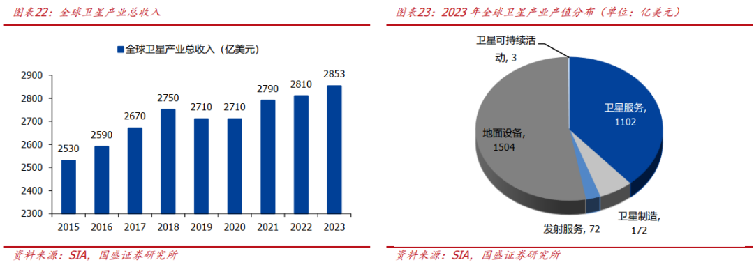 卫星产业是“十五五”国家重点发展的战略新兴产业,作为军民两用共振的万亿大赛道战略意义十分重大。战略意义方面,卫星互联网广覆盖、低延时、宽带化、低成本的特点决定其是实现空天地互联不可或缺的重要环节,俄乌战场Starlink大放光彩更是证明其在军用领域的发展潜力。政策方面,“十五五”规划建议提出“加快新能源、新材料、航空航天、低空经济等战略性新兴产业集群发展”、“加强网络、数据、人工智能、生物、生态、核、太空、深海、极地、低空等新兴领域国家安全能力建设”,“十五五”卫星产业的发展已然非常确定。市场空间方面,SIA数据显示2023年全球卫星产业总产值2853亿美元。