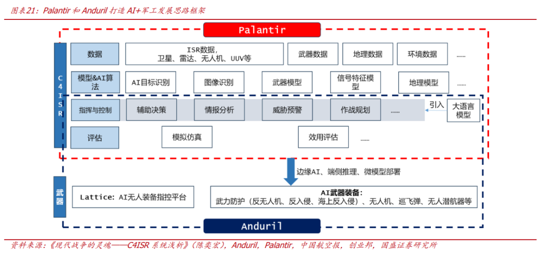 1)军工AI:美国军工AI发展已诞生如Palantir、Anduril的新贵,重点关注国内在军工AI领域中游核心卡位环节及下游无人装备环节。