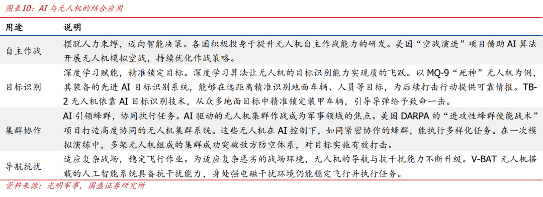 无人机:AI技术的关键应用载体。无人机业务范围包括、侦察监视、精确打击、电子对抗、战场支援等,AI技术的深度融入将全方位推动无人机实现跨越式发展,成为战场关键力量。