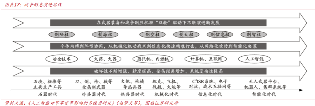 AI+军工是大势所趋,“制智权”已成为现代战争制胜关键。自2022年ChatGPT问世以来,全球已掀起前所未有的AI发展浪潮,中国Deepseek横空出世进一步加速大模型应用,各行业均在抢跑AI赋能推动行业革新。随着以AI技术为代表的第四次工业革命的到来,军事领域或将掀起新一轮重大变革,军事装备、战争制胜机理和作战概念也将继续不断演进和发展。