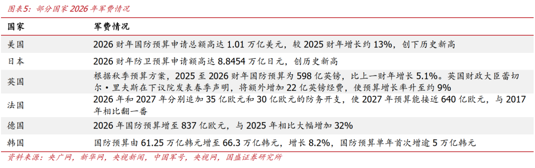 全球局势角度:百年未有之大变局仍在加速演进,全球地缘摩擦不断,根据央广网、新华网等,2026年多个国家和地区的军费预算均显著增长甚至创历史新高。