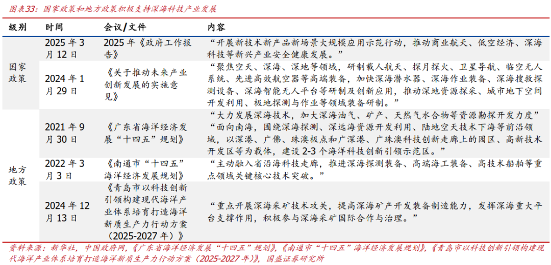 深海科技政策高度足够高。2025年《政府工作报告》提出“开展新技术新产品新场景大规模应用示范行动,推动商业航天、低空经济、深海科技等新兴产业安全健康发展。”深海科技与商业航天、低空经济获得了齐头并进的政策高度,将为海洋经济发展注入新动力,有望成为未来经济增长的重要引擎,预示着我国深海事业将迎来新的发展机遇。