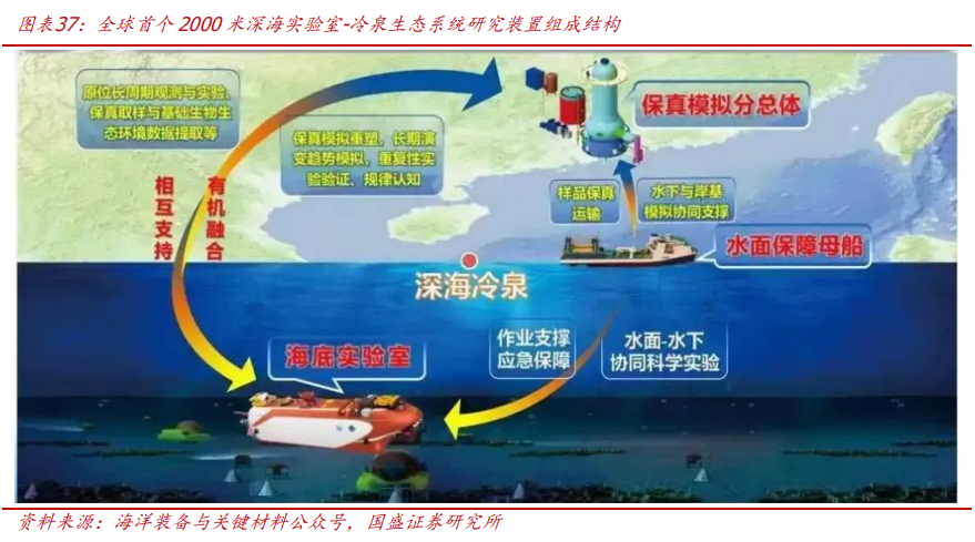 我国已开建全球首个2000米级海底空间站,2030年深海空间部署在即,未来1-10放量可期。根据新闻联播,冷泉生态系统研究装置已在广州南沙正式开工建设,计划用5年时间建设,其海底实验室部分将是全球首个2000米级坐底式可载人长期驻留的深海实验室。该深海实验室可以支持6名科学家,在深海原位开展30天的海底原位实验。我们认为冷泉海底实验室的建立代表着深海空间站的技术已经取得了阶段性成果,未来更多更大的海底空间站将有望陆续开始建设。