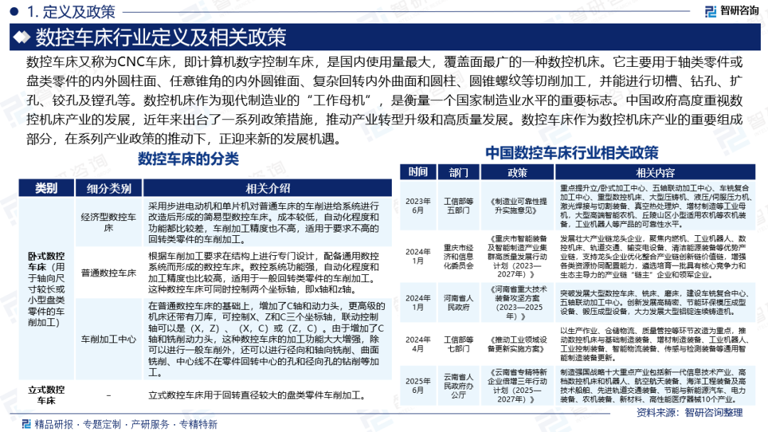 行业政策:数控机床作为现代制造业的“工作母机”,是衡量一个国家制造业水平的重要标志。中国政府高度重视数控机床产业的发展,近年来出台了一系列政策措施,推动产业转型升级和高质量发展。数控车床作为数控机床产业的重要组成部分,在系列产业政策的推动下,正迎来新的发展机遇。例如,2024年4月,工信部等七部门印发《推动工业领域设备更新实施方案》,以生产作业、仓储物流、质量管控等环节改造为重点,推动数控机床与基础制造装备、增材制造装备、工业机器人、工业控制装备、智能物流装备、传感与检测装备等通用智能制造装备更新。2025年6月,云南省人民政府办公厅印发《云南省专精特新企业倍增三年行动计划(2025—2027年)》,提出,制造强国战略十大重点产业包括新一代信息技术产业、高档数控机床和机器人、航空航天装备、海洋工程装备及高技术船舶、先进轨道交通装备、节能与新能源汽车、电力装备、农机装备、新材料、高性能医疗器械10个产业。