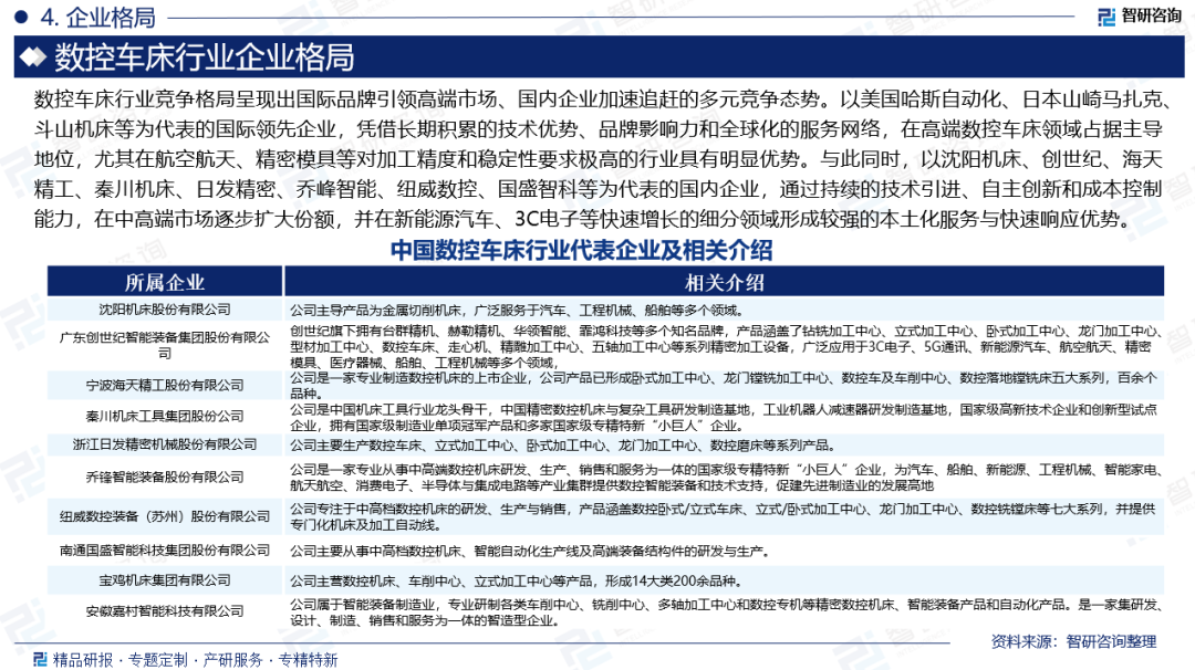 企业格局:数控车床行业竞争格局呈现出国际品牌引领高端市场、国内企业加速追赶的多元竞争态势。以美国哈斯自动化、日本山崎马扎克、斗山机床等为代表的国际领先企业,凭借长期积累的技术优势、品牌影响力和全球化的服务网络,在高端数控车床领域占据主导地位,尤其在航空航天、精密模具等对加工精度和稳定性要求极高的行业具有明显优势。与此同时,以沈阳机床、创世纪、海天精工、秦川机床、日发精密、乔峰智能、纽威数控、国盛智科等为代表的国内企业,通过持续的技术引进、自主创新和成本控制能力,在中高端市场逐步扩大份额,并在新能源汽车、3C电子等快速增长的细分领域形成较强的本土化服务与快速响应优势。当前,国内企业正从规模扩张向质量提升与技术突破转型,逐步向高端市场渗透,而国际企业则通过本地化生产与服务优化巩固其市场地位,行业整体呈现技术竞争加剧、市场分层清晰、内外资企业协同竞争的发展格局。