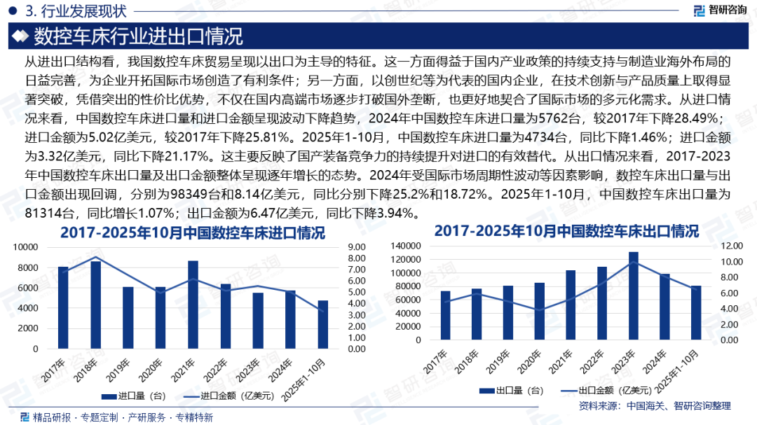 数控车床又称为CNC车床,即计算机数字控制车床,是国内使用量最大,覆盖面最广的一种数控机床。它主要用于轴类零件或盘类零件的内外圆柱面、任意锥角的内外圆锥面、复杂回转内外曲面和圆柱、圆锥螺纹等切削加工,并能进行切槽、钻孔、扩孔、铰孔及镗孔等。数控车床分为立式数控车床和卧式数控车床两种类型。立式数控车床用于回转直径较大的盘类零件车削加工。卧式数控车床用于轴向尺寸较长或小型盘类零件的车削加工。其中,卧式数控车床按功能可进一步分为经济型数控车床、普通数控车床和车削加工中心。数控车床是数控机床的主要品种之一,自20世纪50年代问世以来,凭借其在单件和小批量生产中加工复杂零件时显著提升劳动生产率、保证加工质量、缩短生产周期并降低对工人技术要求等核心优势,迅速成为制造业技术革新的关键方向,在全球范围内获得高度重视与持续发展。近年来,随着我国新能源汽车、航空航天、高端模具等战略性新兴产业的蓬勃崛起,这些领域对高精度、高可靠性装备的“质”的需求,替代了传统投资拉动的“量”的需求,成为驱动行业发展的核心动力,直接带动了我国数控车床行业的快速进步与规模扩张。数据显示,中国数控车床行业市场规模从2020年的456.4亿元增长至2024年的605.5亿元,年复合增长率为7.32%。未来,随着下游产业对高精度、复合化与智能化需求的不断提升,数控车床将向高效、柔性、集成的整体解决方案方向加速演进,预计2025年中国数控车床行业市场规模将达到631.68亿元。从进出口结构看,我国数控车床贸易呈现以出口为主导的特征。这一方面得益于国内产业政策的持续支持与制造业海外布局的日益完善,为企业开拓国际市场创造了有利条件;另一方面,以创世纪等为代表的国内企业,在技术创新与产品质量上取得显著突破,凭借突出的性价比优势,不仅在国内高端市场逐步打破国外垄断,也更好地契合了国际市场的多元化需求。从进口情况来看,中国数控车床进口量和进口金额呈现波动下降趋势,2024年中国数控车床进口量为5762台,较2017年下降28.49%;进口金额为5.02亿美元,较2017年下降25.81%。2025年1-10月,中国数控车床进口量为4734台,同比下降1.46%;进口金额为3.32亿美元,同比下降21.17%。这主要反映了国产装备竞争力的持续提升对进口的有效替代。从出口情况来看,2017-2023年中国数控车床出口量及出口金额整体呈现逐年增长的态势。2024年受国际市场周期性波动等因素影响,数控车床出口量与出口金额出现回调,分别为98349台和8.14亿美元,同比分别下降25.2%和18.72%。2025年1-10月,中国数控车床出口量为81314台,同比增长1.07%;出口金额为6.47亿美元,同比下降3.94%。数控车床行业竞争格局呈现出国际品牌引领高端市场、国内企业加速追赶的多元竞争态势。以美国哈斯自动化、日本山崎马扎克、斗山机床等为代表的国际领先企业,凭借长期积累的技术优势、品牌影响力和全球化的服务网络,在高端数控车床领域占据主导地位,尤其在航空航天、精密模具等对加工精度和稳定性要求极高的行业具有明显优势。与此同时,以沈阳机床、创世纪、海天精工、秦川机床、日发精密、乔峰智能、纽威数控、国盛智科等为代表的国内企业,通过持续的技术引进、自主创新和成本控制能力,在中高端市场逐步扩大份额,并在新能源汽车、3C电子等快速增长的细分领域形成较强的本土化服务与快速响应优势。当前,国内企业正从规模扩张向质量提升与技术突破转型,逐步向高端市场渗透,而国际企业则通过本地化生产与服务优化巩固其市场地位,行业整体呈现技术竞争加剧、市场分层清晰、内外资企业协同竞争的发展格局。
