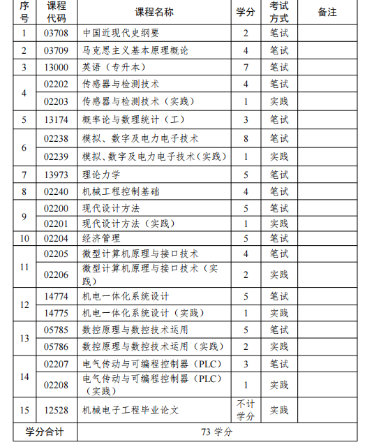 根据江苏省统一考试计划及主考学校要求,机械电子工程(专升本)专业课程体系由公共基础课、专业核心课和学位课程等多个模块构成,总学分不低于73学分。