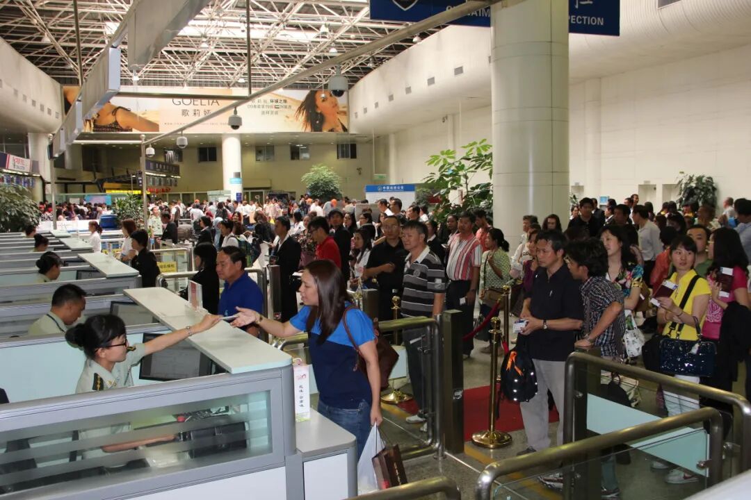 图为:昆明长水机场出入境现场,出境启用10条快捷通道,入境启用11条快捷通道。